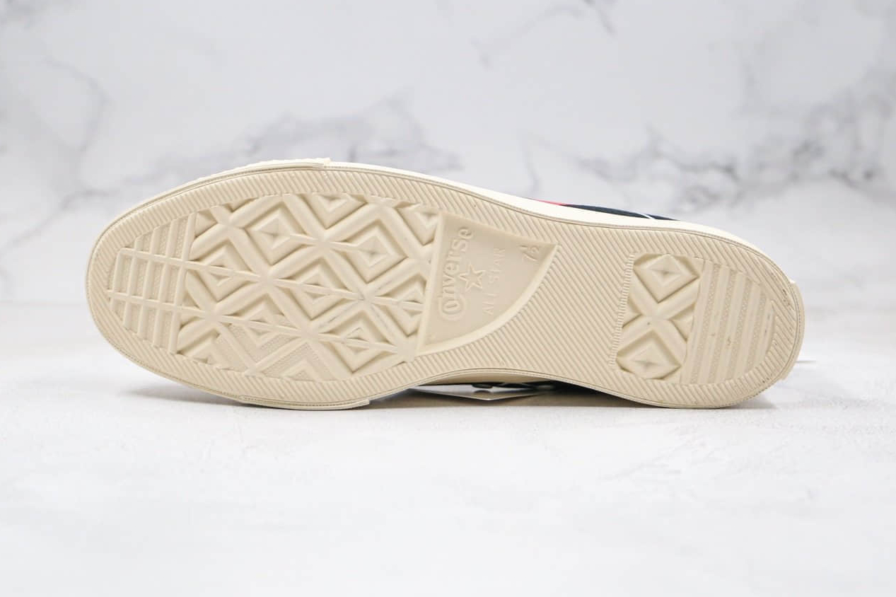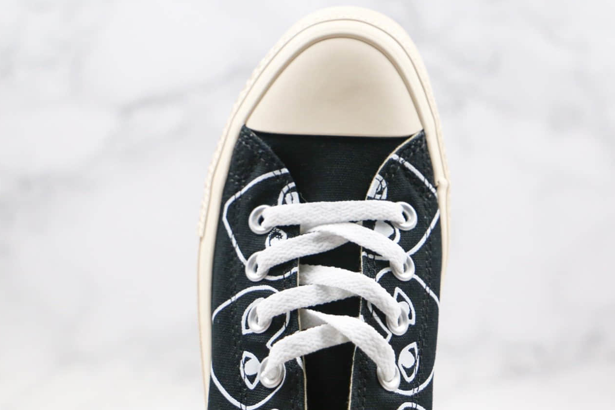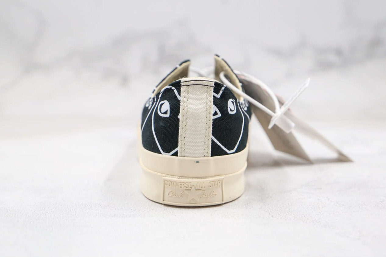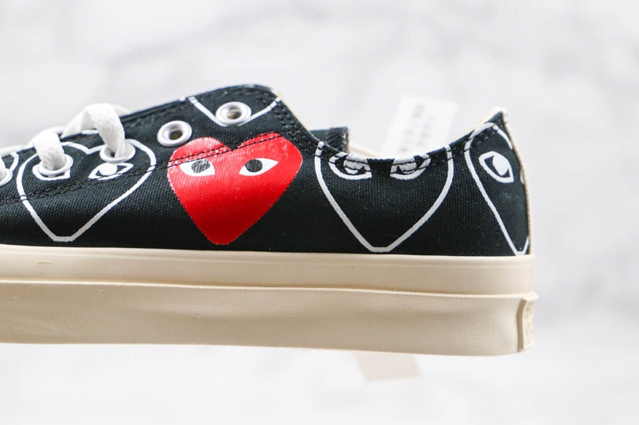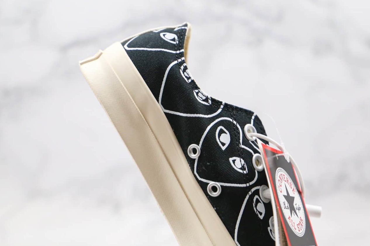 This CDG x Converse collaboration showcases a distinctive multi-heart pattern incorporated throughout the design, injecting an element of artistic flair to the traditional Chuck Taylor silhouette. The contrasting black, white, and red color scheme creates a bold and eye-catching visual appeal.