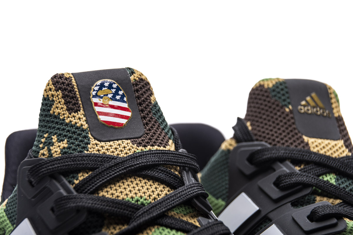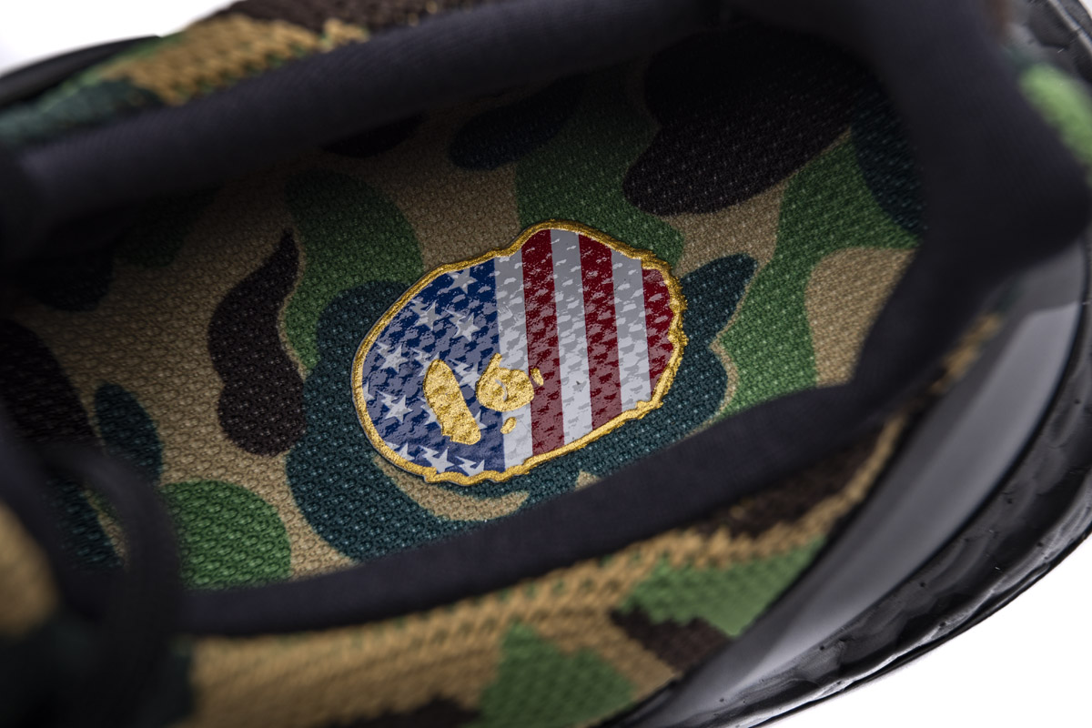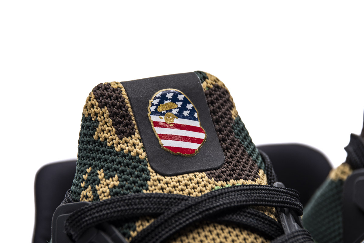 3. Collaborative Branding: The shoe showcases the Adidas and BAPE collaboration through subtle branding details. The Adidas three-stripe branding is featured on the side, while the classic BAPE ape logo can be found on the tongue and heel tab.