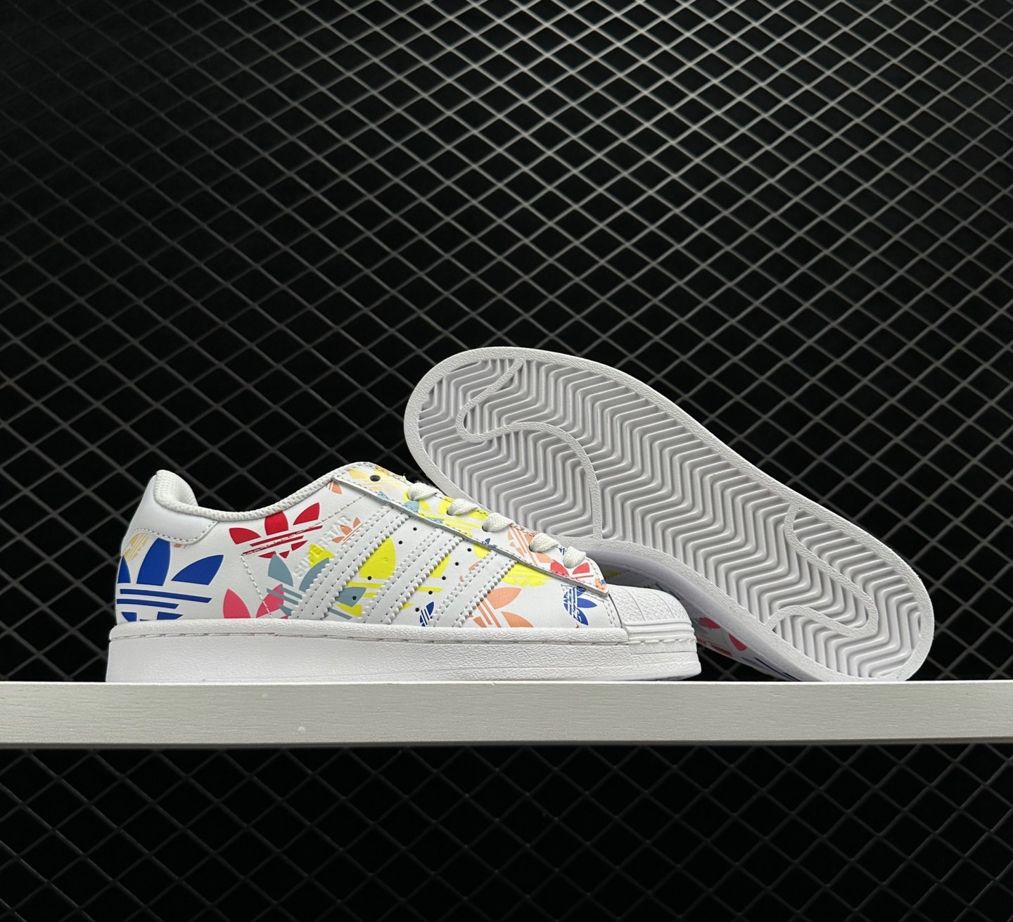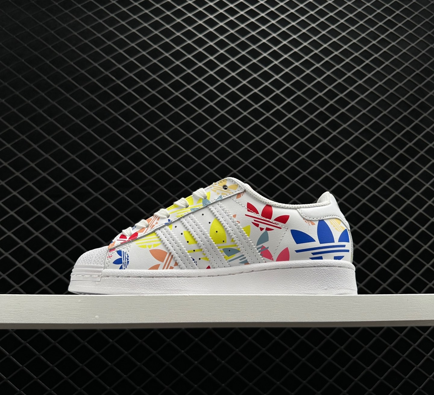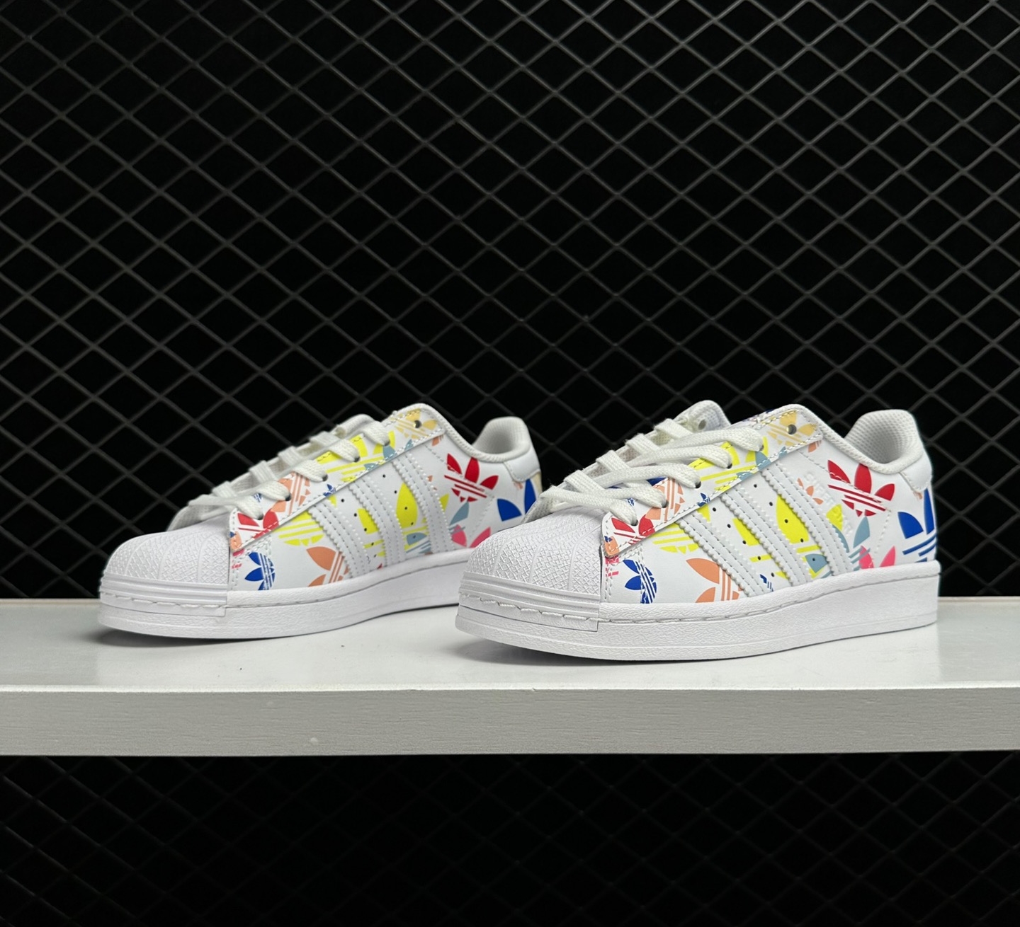2. Premium Construction: Crafted with the finest materials, the Adidas Superstar ‘Allover Trefoil – White Multi’ H00183 guarantees top-notch quality. The durable leather upper ensures the shoe’s longevity, while the rubber shell toe provides added protection.