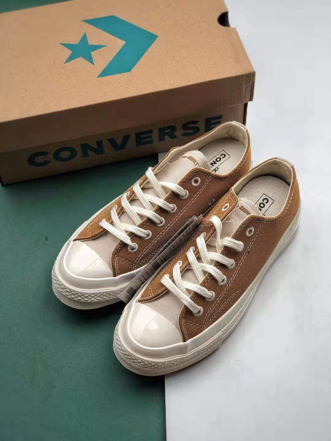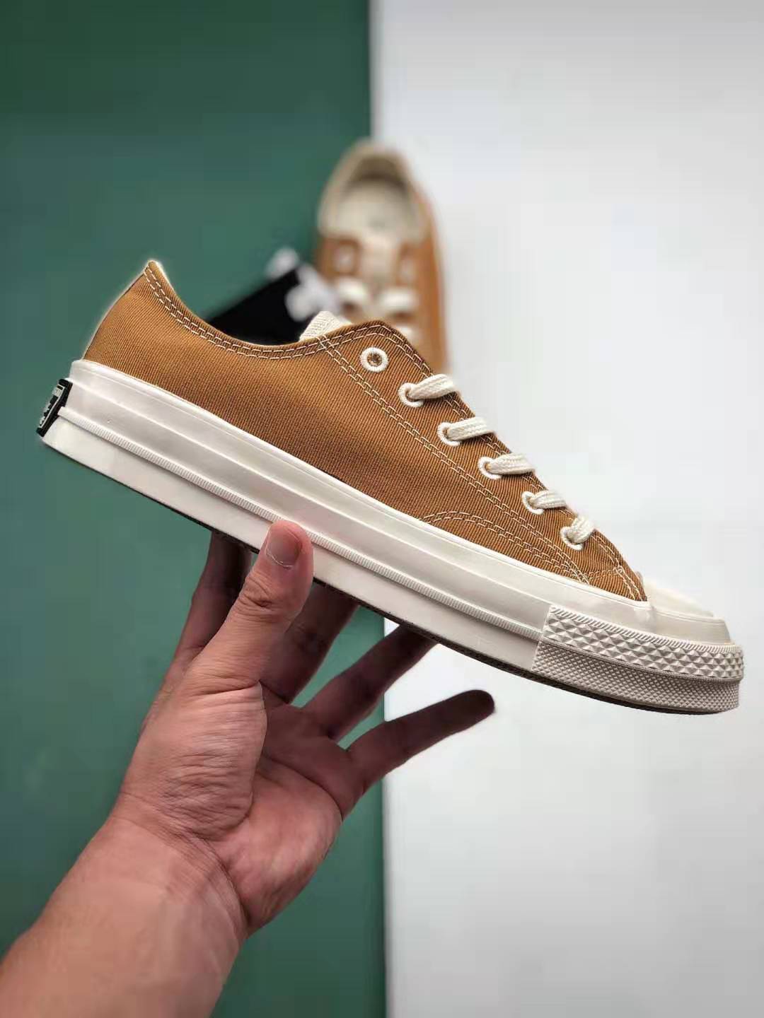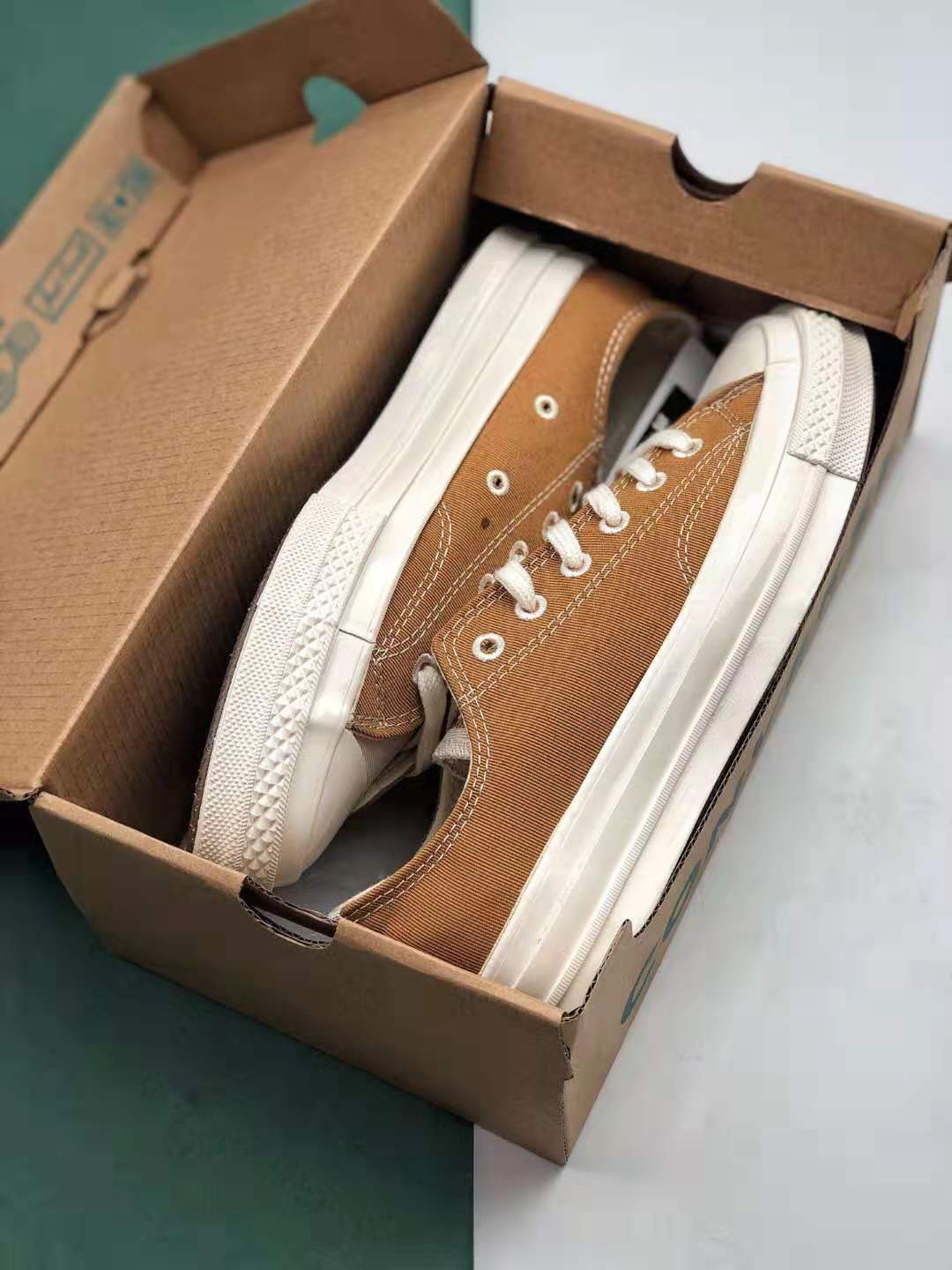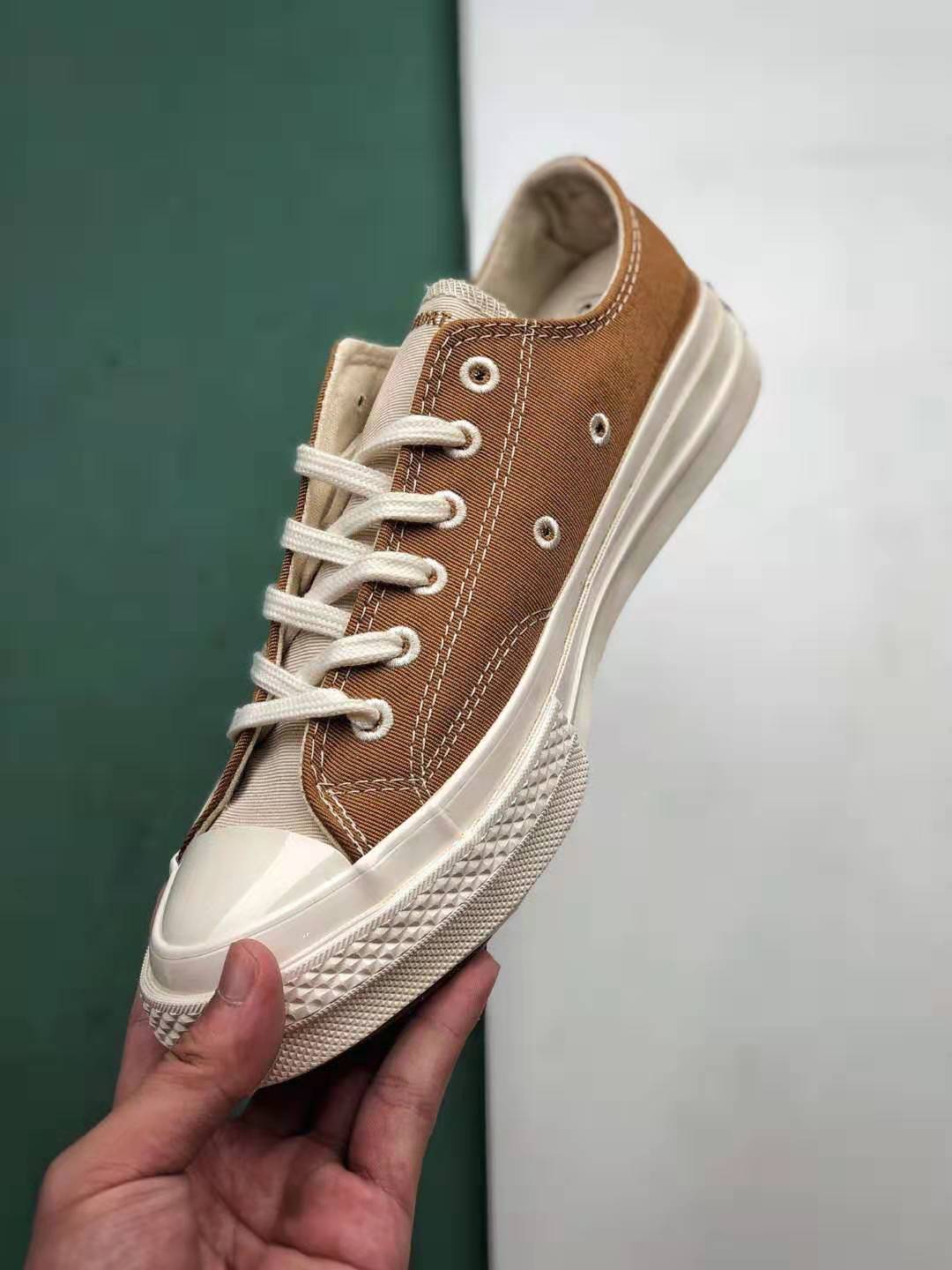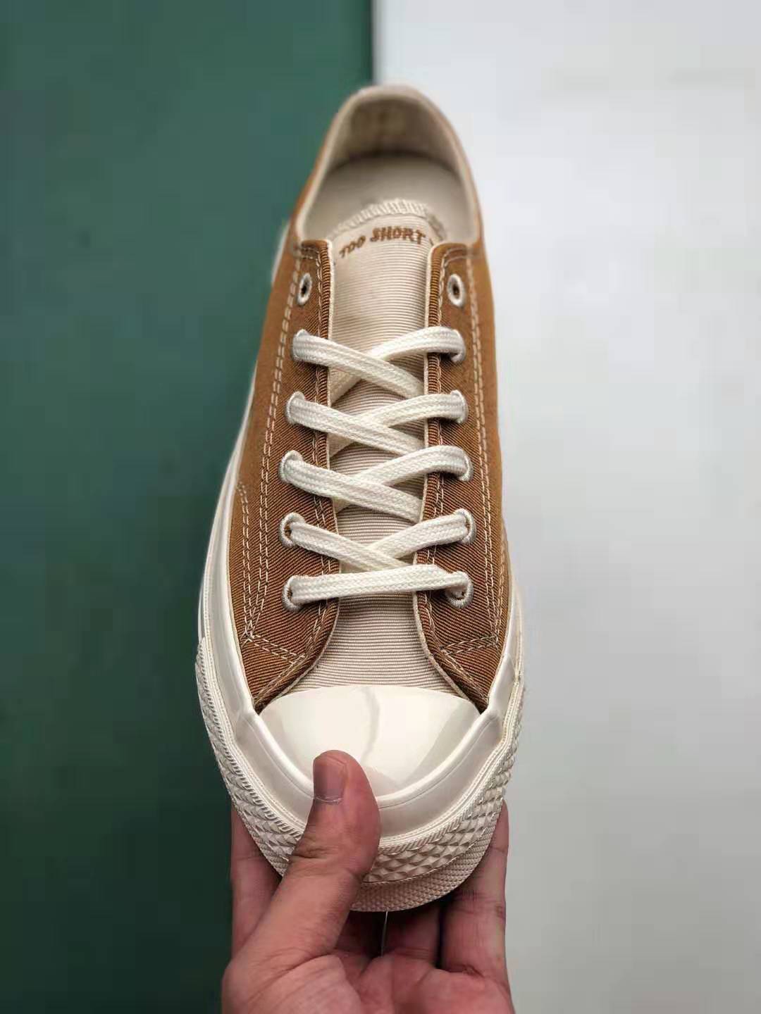 1. Timeless Design: The Chuck 70 ‘Brown Ivory’ stays true to its heritage with the signature Chuck Taylor silhouette, featuring a high-top construction and rubber toe cap.