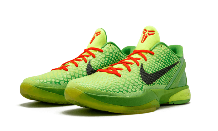 The Nike Zoom Kobe 6 Protro ‘Grinch’ is available in both men’s and women’s sizing. Its vibrant upper combines a mix of electric green, red, and black colorways, reflecting the iconic Grinch theme. The shoe features a lace-up closure system for a customizable fit, allowing players to find their ideal level of support. Designed with a lightweight construction, it ensures agility without sacrificing stability. The Nike Swoosh logo is prominently displayed on the lateral side, while ‘Grinch’ branding can be found on the heel and insole. This basketball shoe combines style, performance, and a playful design, making it a must-have for any sneaker enthusiast or Kobe Bryant fan.