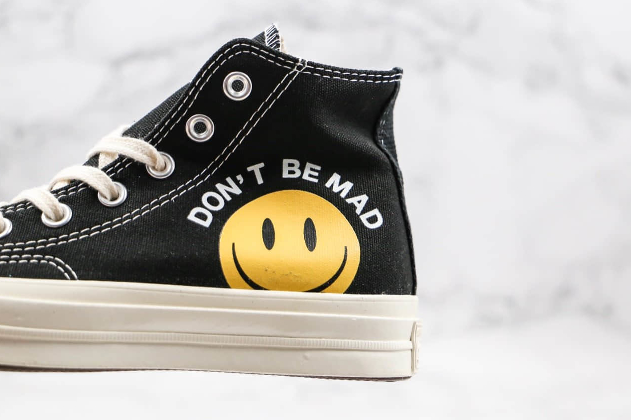 The Converse Chuck Taylor All-Star Dont Be Mad Smile Face Black High Top 168046C is a stylish and playful addition to your sneaker collection. With its iconic design and versatile black color, these high-top sneakers will complement any casual outfit. The unique smile face graphic on the side adds a fun twist to the classic Chuck Taylor style, making them perfect for those who like to express their personality through their footwear.