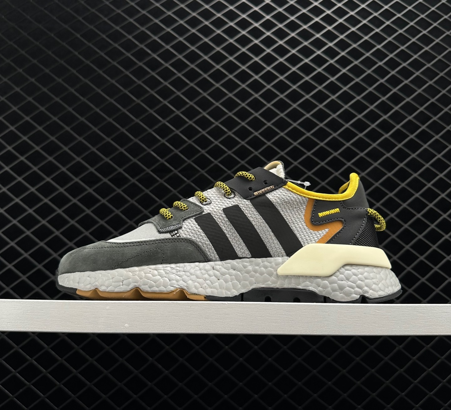 The Adidas Originals Nite Jogger Gray Yellow GY0019 is a contemporary and stylish pair of sneakers that seamlessly merges fashion with function. These sneakers are perfect for those who crave a stylish look while remaining comfortable throughout the day. The sleek gray and yellow design is eye-catching and versatile, making it easy to pair with any outfit. With its unique reflective detailing, these sneakers truly shine, making you stand out from the crowd both day and night.